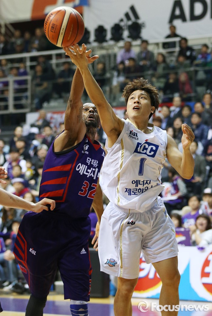 (고양=포커스뉴스) 29일 고양체육관에서 열린 2015-2016 프로농구 챔피언결정전 6차전 오리온-KCC 경기에서 KCC 김태술이 오리온 헤인즈의 수비를 따돌리며 레이업슛을 시도하고 있다.