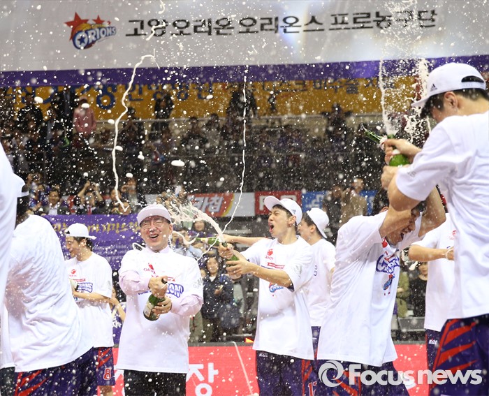 (고양=포커스뉴스) 29일 고양체육관에서 열린 2015-2016 프로농구 챔피언결정전에서 KCC를 4승2패로 물리치고 우승을 차지한 오리온 선수들이 샴페인을 뿌리며 환호하고 있다.