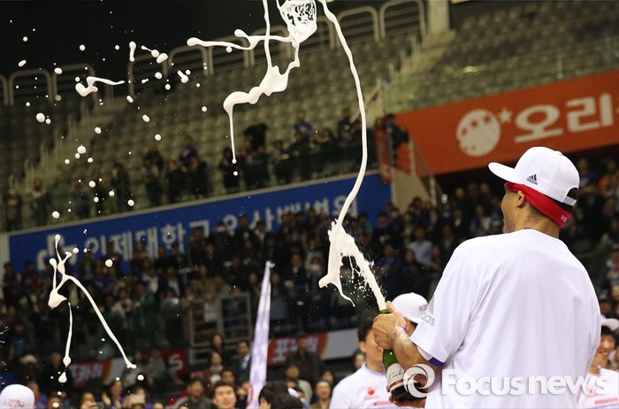 (고양=포커스뉴스) 29일 고양체육관에서 열린 2015-2016 프로농구 챔피언결정전에서 KCC를 4승2패로 물리치고 우승을 차지한 오리온 문태종이 샴페인을 뿌리고 있다.