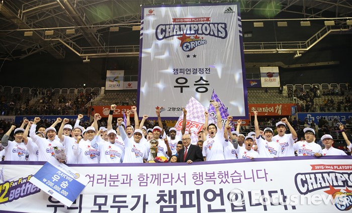 (고양=포커스뉴스) 29일 고양체육관에서 열린 2015-2016 프로농구 챔피언결정전 6차전에서 승리하며 4승 2패로 우승한 오리온 선수들과 김영기 KBL 총재가 기념사진을 찍고 있다.