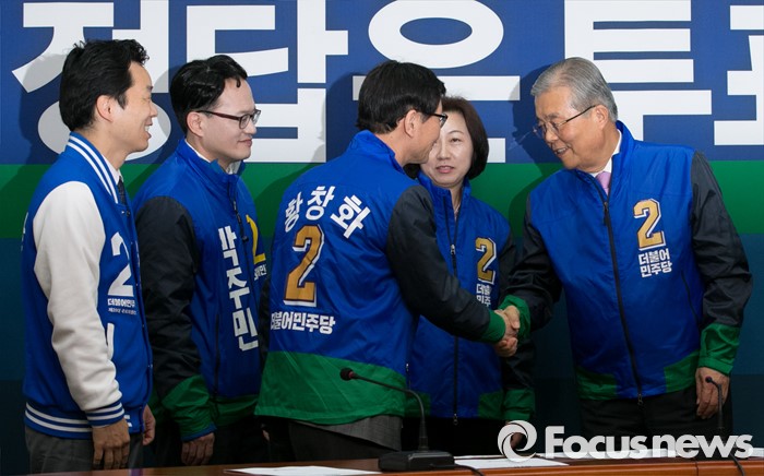 (서울=포커스뉴스) 김종인 더불어민주당 비대위 대표와 20대 총선 후보들이 30일 오전 서울 여의도 국회에서 더민주 후보들의 새정치 약속 발표를 마친 뒤 악수하고 있다.
