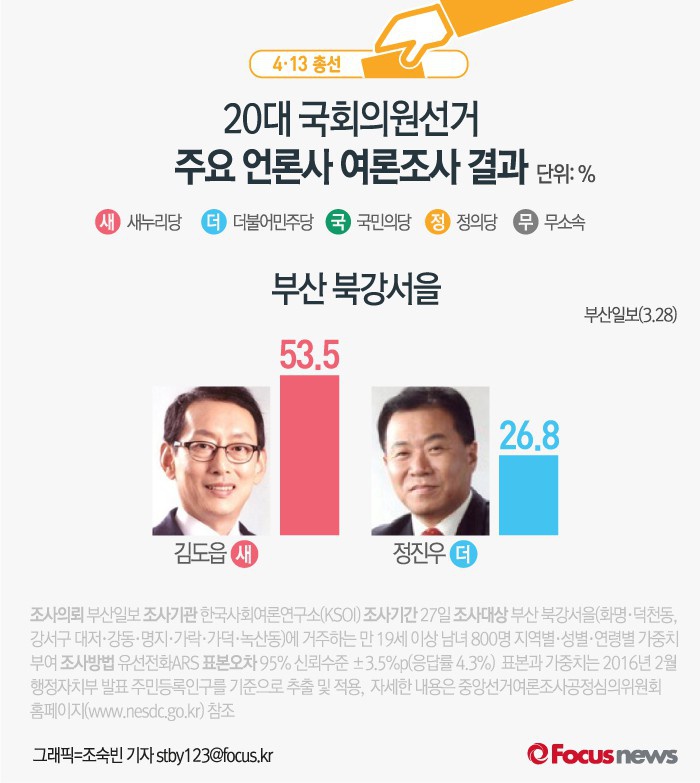 (서울=포커스뉴스) 지난 28일 부산일보는 20대 총선 여론조사 결과을 발표했다. 이 조사 결과에 따르면 김도읍(북강서을·새누리), 전재수(북강서갑·더민주)가 초반 상승세를 보이고 있는 것으로 나타났다.
