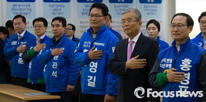 (인천=포커스뉴스) 김종인(가운데) 더불어민주당 비대위 대표와 후보들이 30일 오후 인천 남동구 정당선거사무소에서 열린 더불어민주당 경제살리기 인천 20대 총선 후보자 연석회의에 참석해 국민의례 하고 있다.