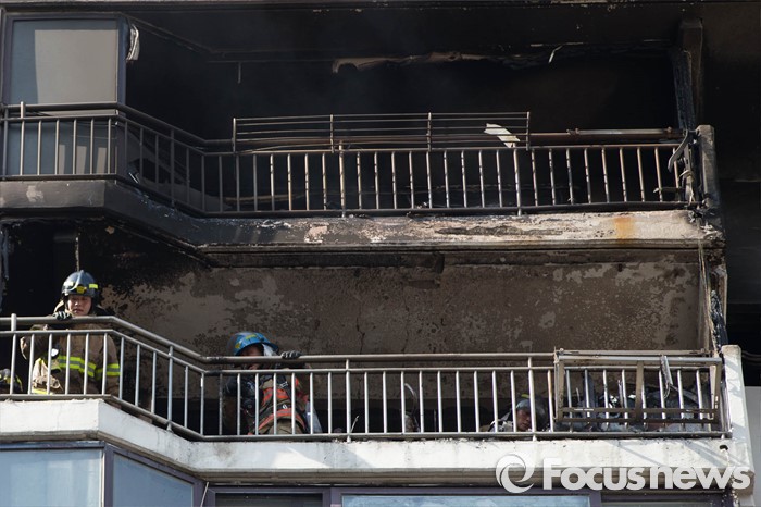 (서울=포커스뉴스) 30일 오후 2시께 서울 서초구의 한 아파트에서 원인모를 불이나 소방관들이 진화작업을 하고 있다.