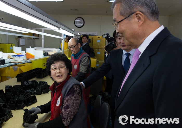 (인천=포커스뉴스) 김종인(오른쪽) 더불어민주당 비대위 대표가 30일 오후 인천 남구 노인인력센터를 방문해 어르신들과 인사하며 지지를 호소하고 있다.