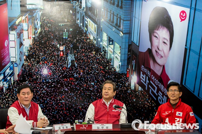 (대구=포커스뉴스) 김무성(가운데) 새누리당 대표와 최경환(왼쪽) 새누리당 대구경북 선거대책위원장, 김문수 새누리당 대구경북 선거대책위원장이 30일 오후 대구 수성구 새누리당 대구시당에서 열린 '선거대책위원회의'에 참석해 회의시작을 기다리고 있다.