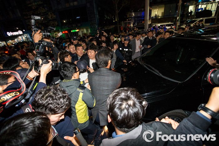(대구=포커스뉴스) 김무성 새누리당 대표가 30일 오후 대구 수성구 새누리당 대구시당에서 열린 '선거대책위원회의'에 참석해 회의를 마친 뒤 차량에 탑승해 이동하자 이재만 새누리당 대구 동구을 예비후보 지지자들이 김 대표의 사퇴를 요구하며 저지하고 있다.