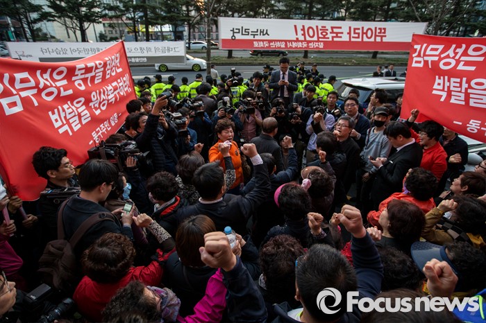(대구=포커스뉴스) 30일 오후 대구 수성구 새누리당 대구시당 앞에서 이재만 새누리당 대구 동구을 예비후보 지지자들이 '선거대책위원회의'에 참석하기 위해 대구를 방문한 김무성 새누리당 대표에게 항의하기 위해 모여 있다.