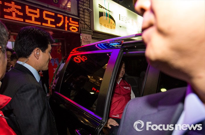 (대구=포커스뉴스) 김무성 새누리당 대표가 30일 오후 대구 동구 새누리당 동구갑 정종섭 후보 선거사무소를 방문한 뒤 동대구역으로 이동하기 위해 차량에 탑승 하고 있다.