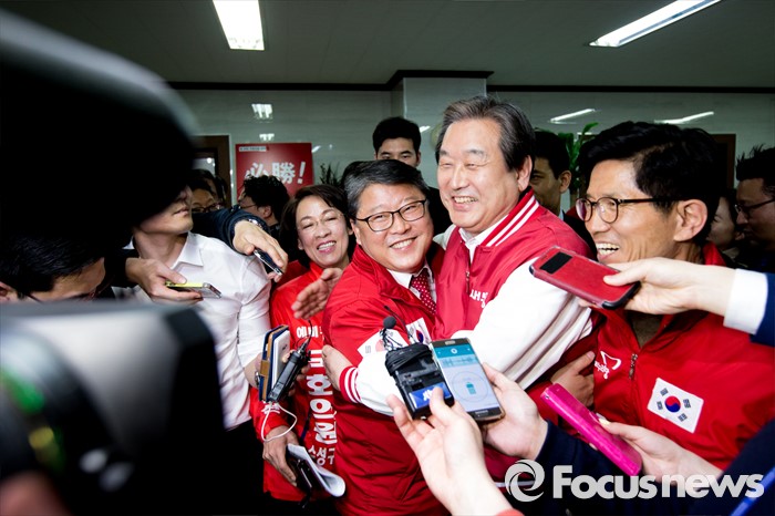 | △ 포옹하는 김무성 대표-조원진 후보 |