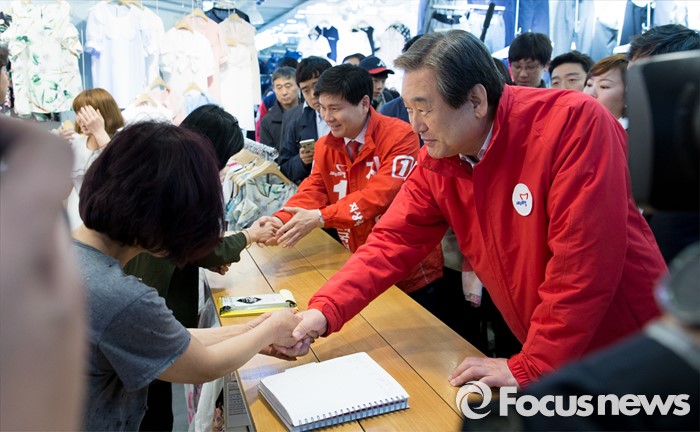 (서울=포커스뉴스) 4.13총선 공식선거운동 첫날인 31일 오전 서울 중구 동대문 누죤에서 김무성 새누리당 공동선대위원장이 지상욱 서울 중구성동구을 후보와 선거운동을 하고 있다.