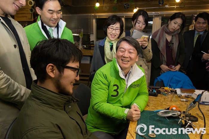 (서울=포커스뉴스) 4.13총선 공식선거운동 첫날인 31일 오전 서울 종로구 세운전자상가 '팹랩 서울(FABLAB SEOUL)'에서 안철수 국민의당 상임공동대표가 미래 일자리 청년 아카데미를 방문해 납땜을 체험하고 있다.