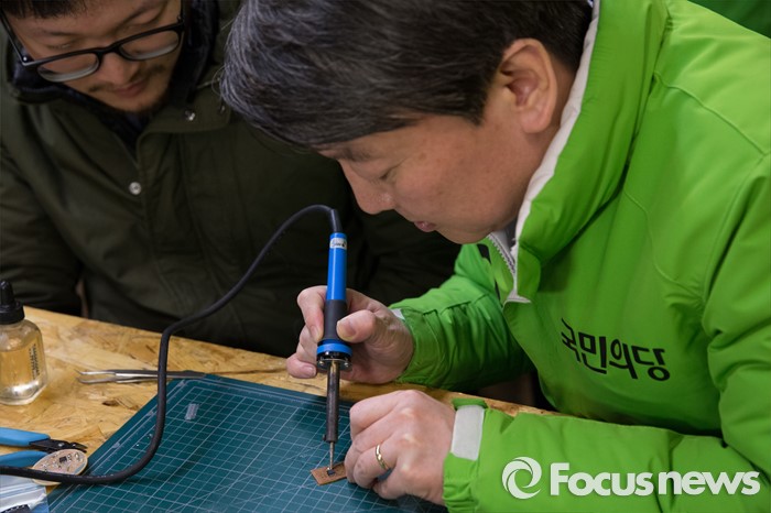 (서울=포커스뉴스) 4.13총선 공식선거운동 첫날인 31일 오전 서울 종로구 세운전자상가 '팹랩 서울(FABLAB SEOUL)'에서 안철수 국민의당 상임공동대표가 미래 일자리 청년 아카데미를 방문해 납땜을 체험하고 있다.