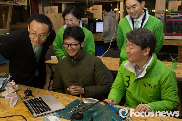 (서울=포커스뉴스) 4.13총선 공식선거운동 첫날인 31일 오전 서울 종로구 세운전자상가 '팹랩 서울(FABLAB SEOUL)'에서 안철수 국민의당 상임공동대표가 미래 일자리 청년 아카데미를 방문해 납땜을 체험 설명을 듣고 있다.