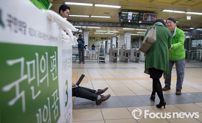 (서울=포커스뉴스) 총선 선거운동이 공식적으로 시작된 31일 오전 안철수 국민의당 노원병 후보가 서울 노원구 수락산역 역사 내에서 지역 주민들에게 출근 인사를 하고 있다.