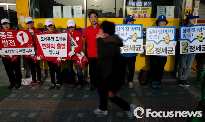 (서울=포커스뉴스) 20대 총선 공식선거 운동이 시작된 31일 오전 서울 동묘앞역 인근 거리에서 오세훈 새누리당, 정세균 더불어민주당 서울 종로구 후보의 선거운동원들이 지지를 호소하고 있다.