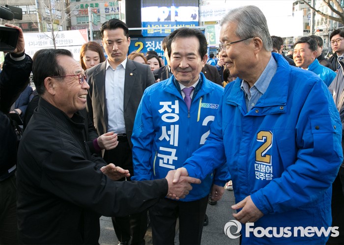 (서울=포커스뉴스) 20대 총선 공식선거 운동이 시작된 31일 오전 서울 동묘앞역 인근 거리에서 김종인(오른쪽) 더불어민주당 비대위 대표 겸 선대위원장과 정세균 서울 종로구 후보가 시민들에게 지지를 호소하고 있다.