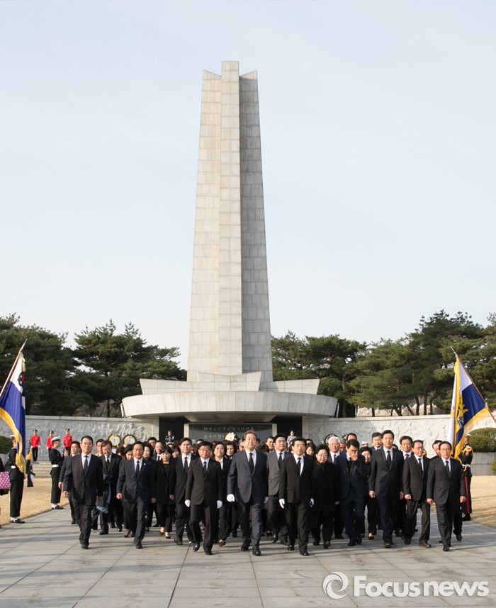 (서울=포커스뉴스) 4.13 총선 공식선거운동이 시작된 31일 오전 서울 동작구 국립현충원에서 김무성 새누리당 대표를 비롯한 지도부와 후보들이 참배를 마친 뒤, 행진하고 있다.