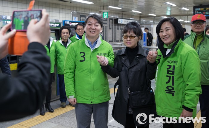 (서울=포커스뉴스) 총선 선거운동이 공식적으로 시작된 31일 오전 안철수 국민의당 상임공동대표(왼쪽)가 서울 강북구 수유동에서 김기옥 강북갑 후보 지원 유세를 하고 있다.