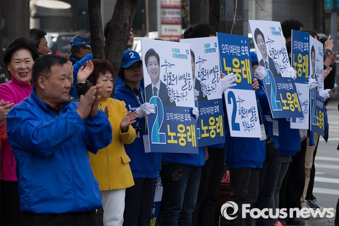 (서울=포커스뉴스) 20대 총선 공식선거 운동이 시작된 31일 오전 서울 마포구 공덕오거리에서 노웅래 더불어민주당 마포갑 후보측이 출근길 선거유세를 하고 있다.