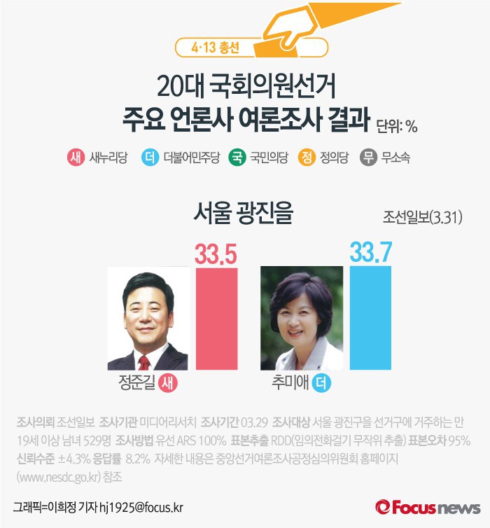 (서울=포커스뉴스) 조선일보가 미디어리서치에 의뢰해 31일 발표한 여론조사 결과에 따르면 새누리당 정준길후보의 지지율은 33.5%, 더불어민주당 추미애후보는 33.7%를 기록했다.
