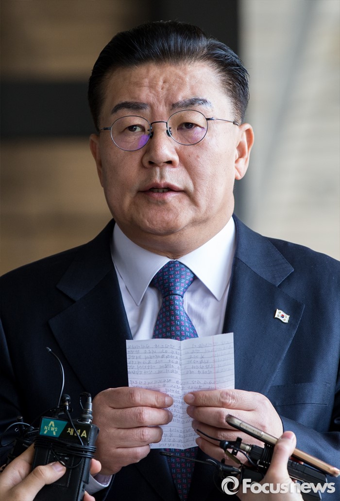 (서울=포커스뉴스) 용산 국제업무지구 개발 관련 금품수수 혐의를 받고 있는 허준영 전 코레일 사장이 31일 오전 서울중앙지검에 출두, 준비한 원고를 읽고 있다.