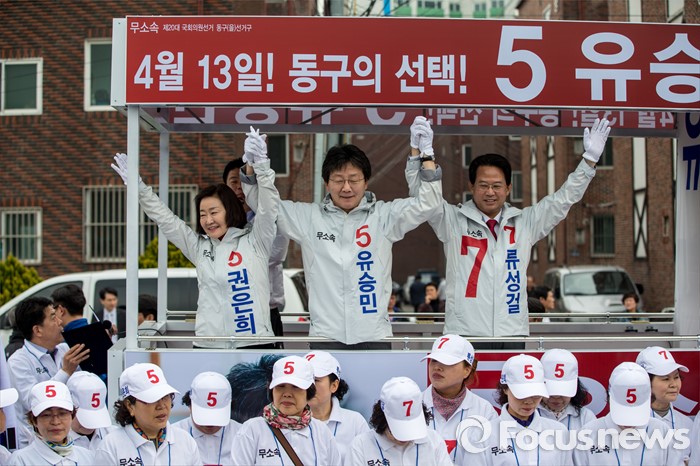 (대구=포커스뉴스) 무소속 대구 동구을 유승민(가운데) 후보, 무소속 대구 북구갑 권은희(왼쪽) 후보, 뭇속 대구 동구갑 류성걸 후보가 31일 오전 대구 동구 공항교에서 열린 공동 출정식을 마친 뒤 손을 맞잡고 있다.