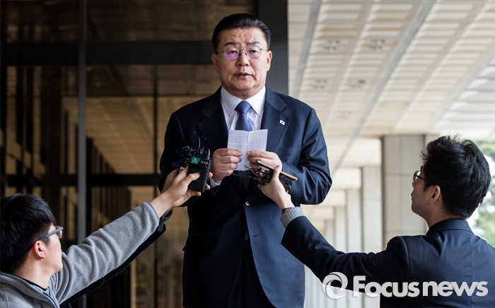 (서울=포커스뉴스) 용산 국제업무지구 개발 관련 금품수수 혐의를 받고 있는 허준영 전 코레일 사장이 31일 오전 서울중앙지검에 출두, 준비한 원고를 읽고 있다.