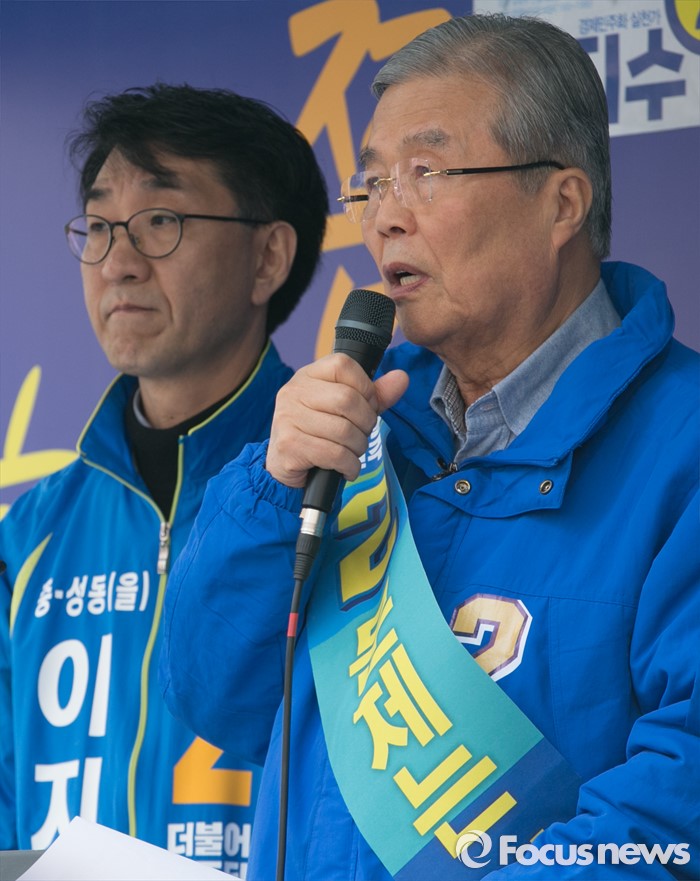 (서울=포커스뉴스) 20대 총선 공식선거 운동이 시작된 31일 오전 서울 남대문시장에서 열린 더불어민주당 중앙선거대책위원회 출정식에 참석한 김종인 비대위 대표 겸 선대위원장이 지지를 호소하고 있다. 왼쪽은 이지수 중구성동을 후보.