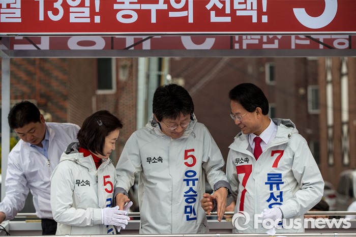 (대구=포커스뉴스) 무소속 대구 동구을 유승민(가운데) 후보, 무소속 대구 북구갑 권은희(왼쪽) 후보, 무소속 대구 동구갑 류성걸 후보가 31일 오전 대구 동구 공항교에서 열린 공동 출정식에 참석해 손을 맞잡고 있다.
