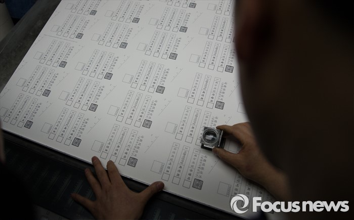 (파주=포커스뉴스) 제20대 총선 선거운동이 공식적으로 시작된 31일 오전 경기도 파주 한 인쇄소에서 직원이 투표용지 교열작업을 하고 있다.