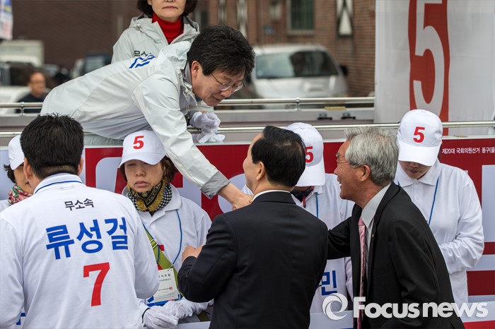 (대구=포커스뉴스) 무소속 대구 동구을 유승민 후보가 31일 오전 대구 동구 공항교에서 열린 선거운동 출정식에 참석해 지지자들과 인사 하고 있다.