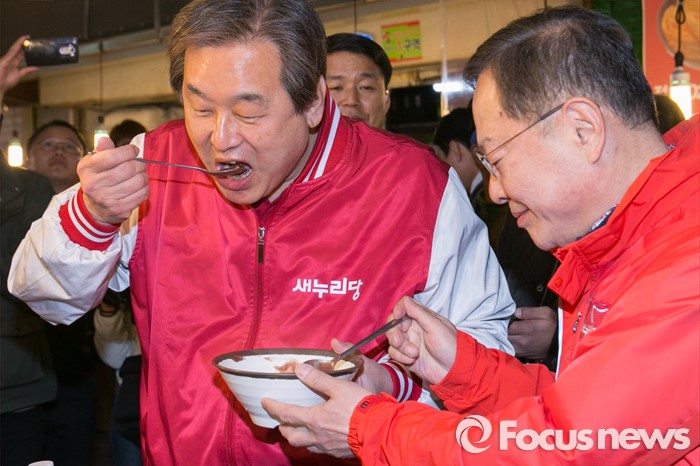 (서울=포커스뉴스) 4.13 총선 공식선거운동이 시작된 31일 오전 서울 마포구 아현시장에서 김무성(왼쪽) 새누리당 대표가 안대희 마포갑 후보와 함께 팥죽을 먹고 있다.