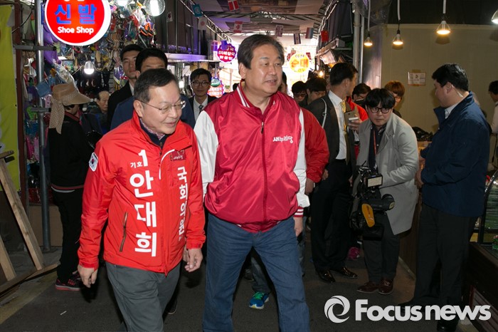 (서울=포커스뉴스) 4.13 총선 공식선거운동이 시작된 31일 오전 서울 마포구 아현시장에서 김무성(오른쪽) 새누리당 대표가 안대희 마포갑 후보와 함께 유세를 하고 있다.
