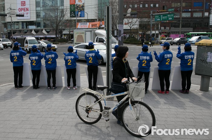 (서울=포커스뉴스) 20대 총선 공식선거 운동이 시작된 31일 오전 서울 장안동사거리에서 민병두 더불어민주당 동대문을 후보 선거운동원들이 지지를 호소하고 있다.