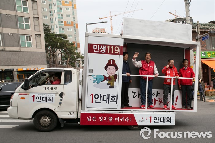 (서울=포커스뉴스) 4.13 총선 공식선거운동이 시작된 31일 오전 서울 마포구 아현시장에서 김무성 새누리당 대표와 안대희 마포갑 후보가 유세 차량에 올라 이동하고 있다.
