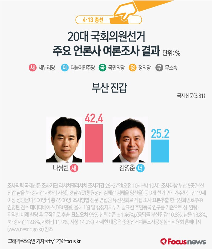 (서울=포커스뉴스) 국제신문이 26~27일(오전 10시~밤 10시)까지 리서치앤리서치에 의뢰해 부산 진갑 선거구에 거주하는 유권자 500명을 대상으로 여론조사를 한 결과, 새누리당 나성린 후보의 지지율은 42.4%, 더민주 김영춘 후보의 지지율은 25.2%인것으로 나타났다.