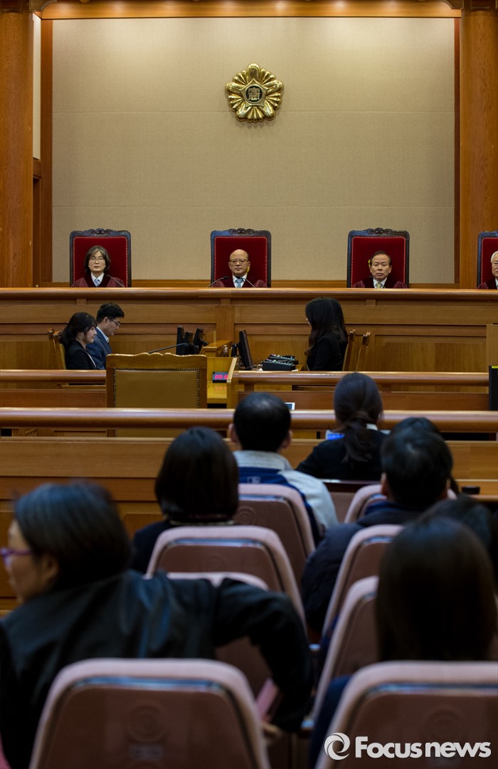 (서울=포커스뉴스) 23일 오후 서울 종로구 헌법재판소 대심판정에서 헌법재판관들이 성매매알선 등 행위의 처벌에 관한 법률(성매매특별법) 제21조 제1항에 대한 위헌성을 심판하고 있다. 헌법재판소는 성매매특별법에 대해 재판관 6대3 의견으로 합헌 결정했다.
