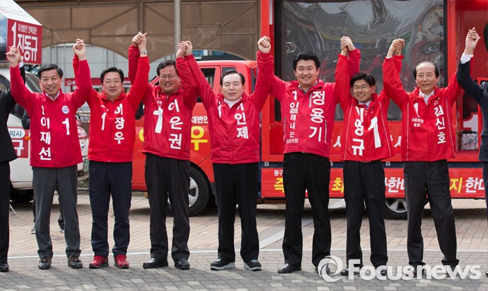 (대전=포커스뉴스) 31일 오후 대전 서대전역광장에서 열린 대전 새누리당 후보자 합동유세에서 후보자들이 필승을 다짐하고 있다. 이날 합동유세이 이인제 중앙선거대책위원회 공동위원장이 참석 했다.