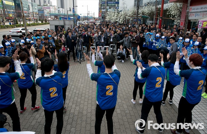 (안산=포커스뉴스) 20대 총선 공식선거 운동이 시작된 31일 오후 경기도 홈플러스 안산고잔점 앞에서 열린 더불어민주당 안산 집중유세에 참여한 유세단이 로고송에 맞춰 율동을 선보이고 있다.
