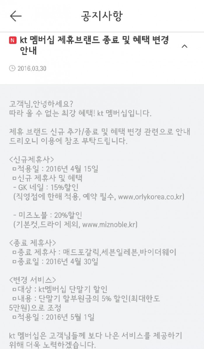 31일 KT에 따르면 4월30일부로 매드포갈릭, 세븐일레븐, 바이더웨이의 제휴할인을 종료한다. 앞서 KT는 4월2일부터 편의점 세븐일레븐과 바이더웨이에서 기존 15% 할인해주던 올레멤버십 혜택을 1000원당 100원 할인으로 변경한다고 공지했으나 이를 시행하기도 전에 종료방침을 밝혔다. KT는 편의점 위드미에도 현행 15% 할인율을 1000원당 100원 할인으로 바꾸자고 제안한 것으로 알려졌다. GS25에서는 제휴할인을 계속해서 진행한다.