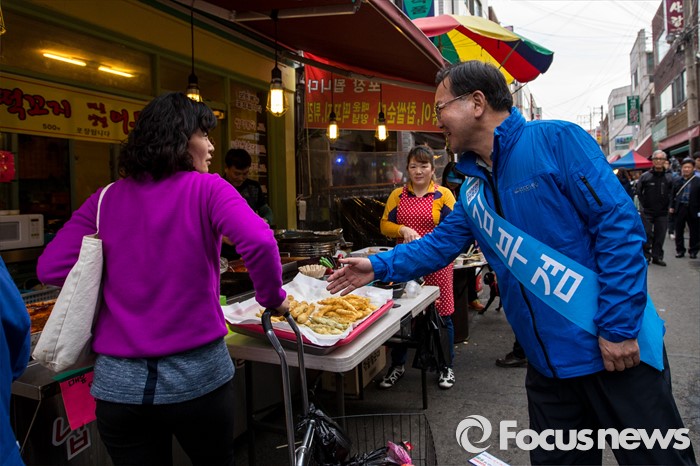 (대구=포커스뉴스) 더불어민주당 대구 수성구갑 김부겸 후보가 31일 오후 대구 수성구 신매시장을 방문해 유권자들에게 한 표를 호소 하고 있다.