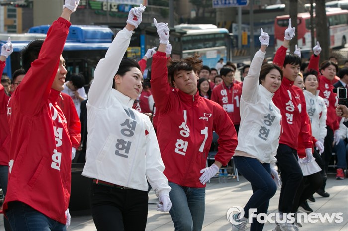 (서울=포커스뉴스) 4.13 총선 공식선거운동이 시작된 31일 오후 서울 서대문구 독립문공원에서 이성헌 새누리당 서대문갑 후보선거운동원들이 춤을 추고 있다.
