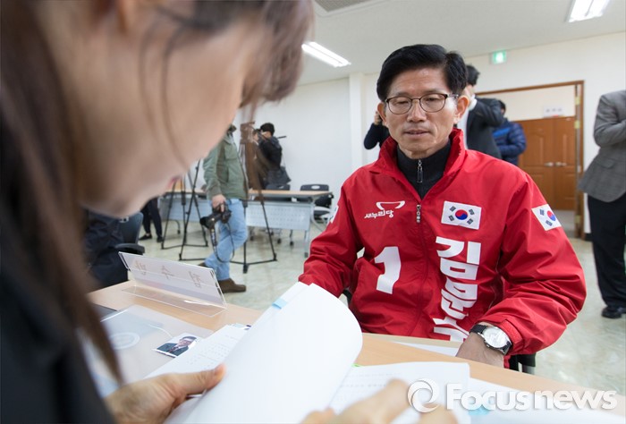 한편, 현재 '여권의 안방'으로 불리는 대구 수성갑에선 김 후보에 맞서는 더불어민주당 김부겸 후보가 강세를 보이고 있다.(대구=포커스뉴스) 24일 오전 대구 수성구 선거관리위원회에서 김문수 새누리당 전 의원이 20대 총선 국회의원 후보 등록을 하고 있다. 2016.03.24 김인철 기자