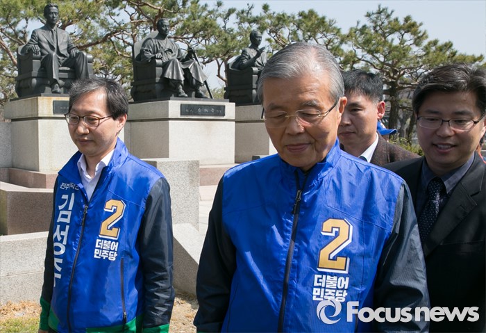 (전주=포커스뉴스) 1일 오전 전북 전주시 덕진공원을 방문한 김종인(오른쪽) 더불어민주당 비대위 대표 겸 선대위원장과 김성주 전주병 후보가 김 대표의 조부인 가인 김병로 선생 등 '법조 3성' 동상을 둘러본 뒤 이동하고 있다.