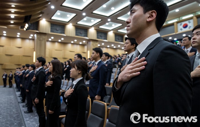 (서울=포커스뉴스) 1일 오전 서울 서초구 대법원 대강당에서 열린 신임 법관 임명식에 참석한 신임 법관들이 국민의례를 하고 있다.