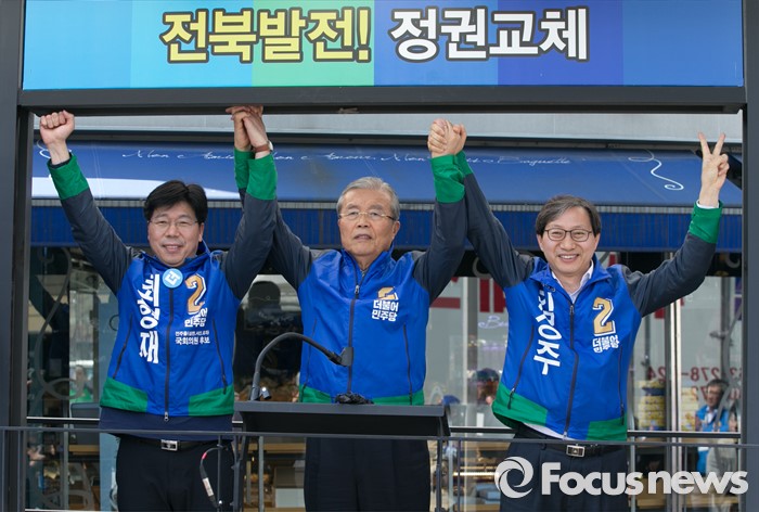 (전주=포커스뉴스) 1일 오전 전북 전주 모래내시장 입구에서 열린 더불어민주당 최형재(왼쪽) 전주을, 김성주(오른쪽) 전주병 후보 유세에 참석한 김종인 비대위 대표 겸 선대위원장이 후보들과 손을 들어 인사하고 있다.