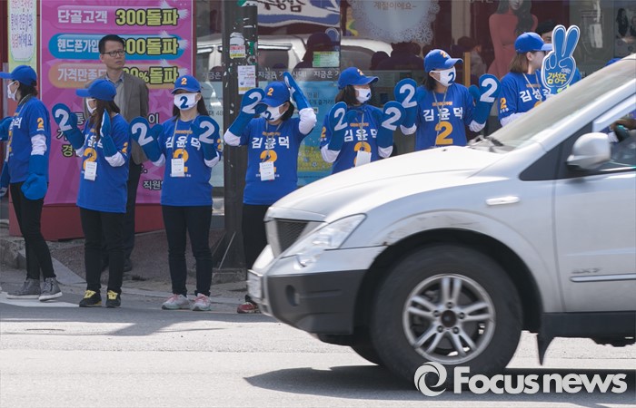 (전주=포커스뉴스) 1일 오전 전북 전주 모래내시장 입구에서 열린 더불어민주당 최형재 전주을, 김성주 전주병 후보 유세에 참여한 선거운동원들이 지지를 호소하고 있다.