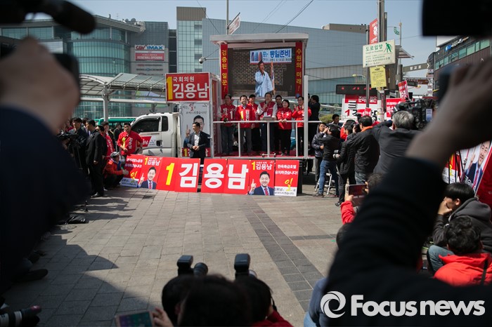 (수원=포커스뉴스) 1일 오전 경기도 수원시 팔달구 수원역 로데오거리 입구에서 새누리당 수원지역 후보자 합동 유세가 열리고 있다.
