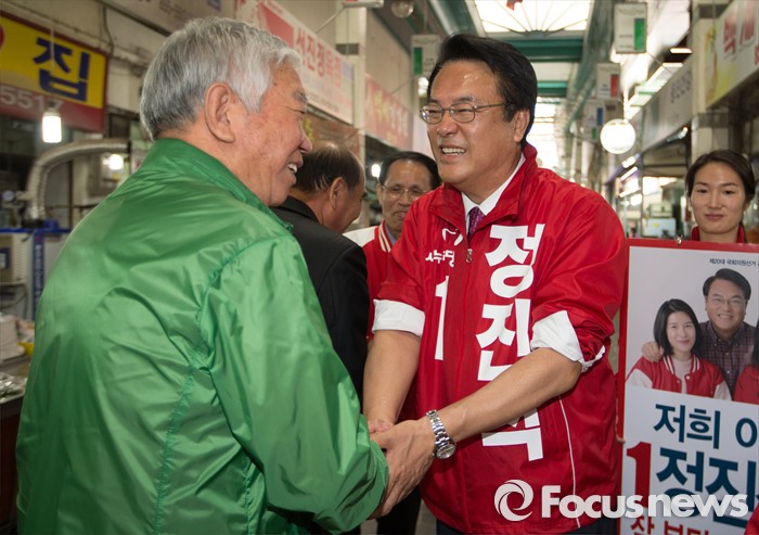 (공주=포커스뉴스) 1일 충남 공주시 산성시장 일원에서 정진석 새누리당 후보가 지지를 호소하고 있다.